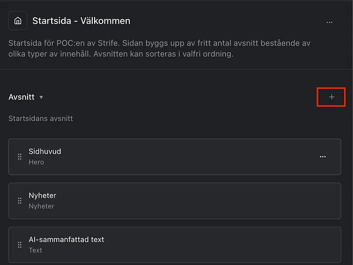 Lägg till ett avsnitt för ”innehåll” på startsidan. Klicka på plustecknet till höger om rubriken ”avsnitt” i vyn för avsnitt. Välj att skapa ett avsnitt för ”innehåll”.