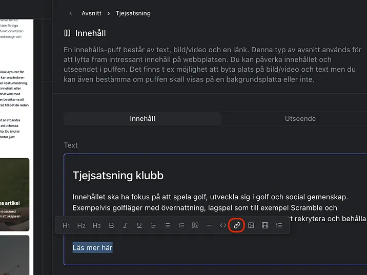 I fritexteditorn i avsnittet, välj länkegenskapen och använd fritextsök för att leta upp den interna sidan som du vill länka till.