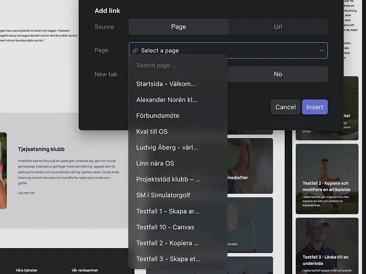 Dialogen för att länka innehåll öppnas upp och du kan välja att länka till en annan sida i Strife eller till en extern sida. Hittar du inte sidan som du vill länka till kan du enkelt söka upp sidan med fritextsökningen.
