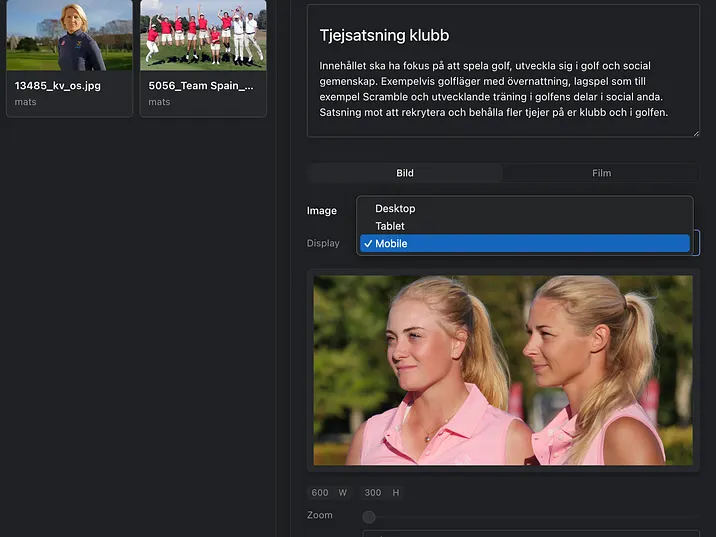 Peka ut en bild och justera bilden för de tre olika enheterna ”desktop”, ”tablet”, ”mobile” genom att välja respektive enhet i dropdown listan bredvid ”display” under ”image”.