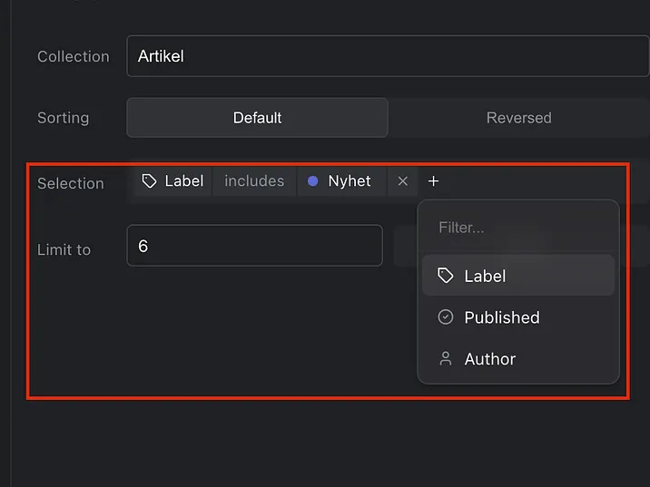 Använd filterfunktionen för att bestämma vilka artiklar som ska visas i listan. Du kan välja att filtrera baserat på etiketter (lable), författare och datum för publicering. Du kan också välja att styra presentationen av ditt urval utefter ”senaste först” eller tvärtom.