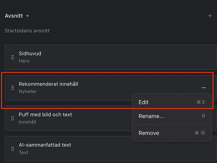 Startsidan består av ett antal avsnitt där ett av dessa listar ”innehåll rekommenderat för dig”. Navigera till startsidan i ”content vyn”. Välj startsidan och välj sedan att redigera avsnittet som heter ”Rekommenderat innehåll”.