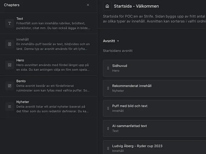 Infoga avsnittet som heter Innehåll genom att klicka på pluset ute till höger.